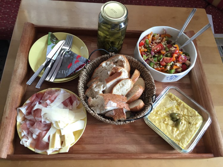 Für die abendliche Jause – kulinarisch im Sinne von „Okzident trifft Orient“ – zu Prosciutto, Parmiggiano und abgewandelter Caprese ( zu wenig reife Paradeiser im Ersatzgarten 😟) – Hummus (Kichererbsenpüree) rasch zubereitet.