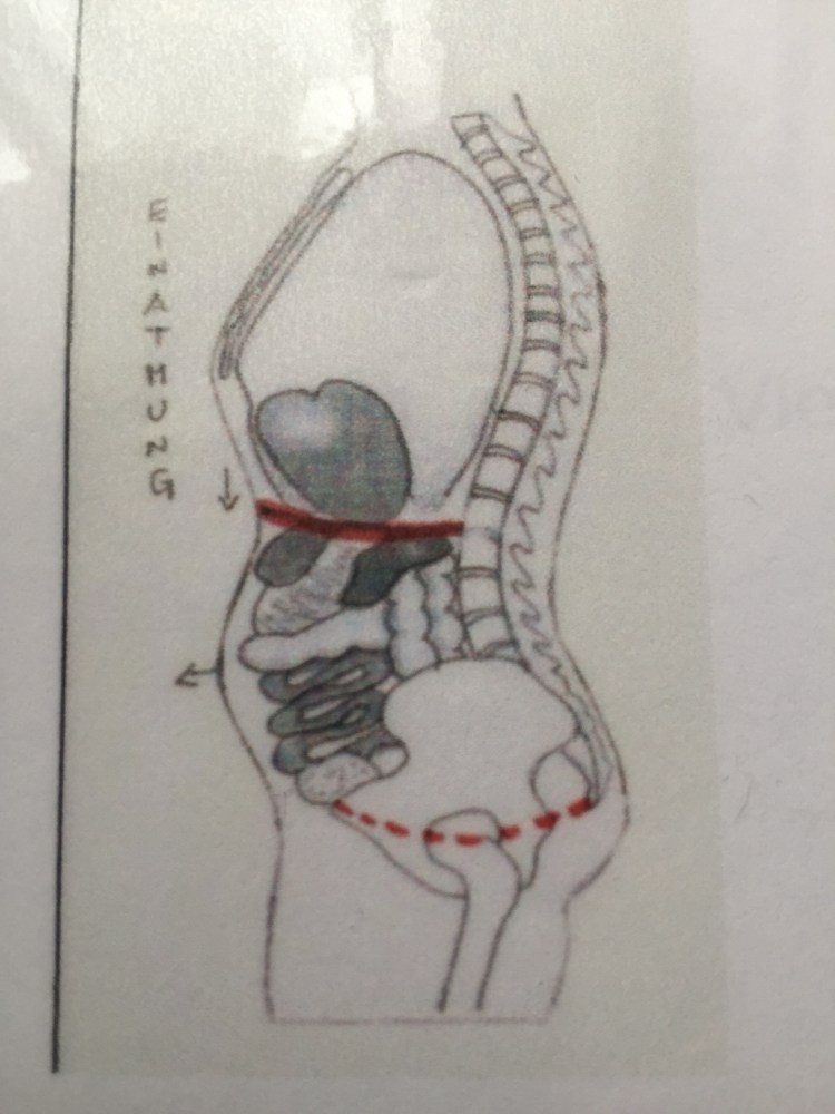 Während der Einatmung wird durch die vergrößerte Lunge das Zwerchfell nach unten gedrückt. Dadurch werden die Bauch- und Beckenorgane nach unten und nach dem Brustkorb auch nach vorne gedrückt.