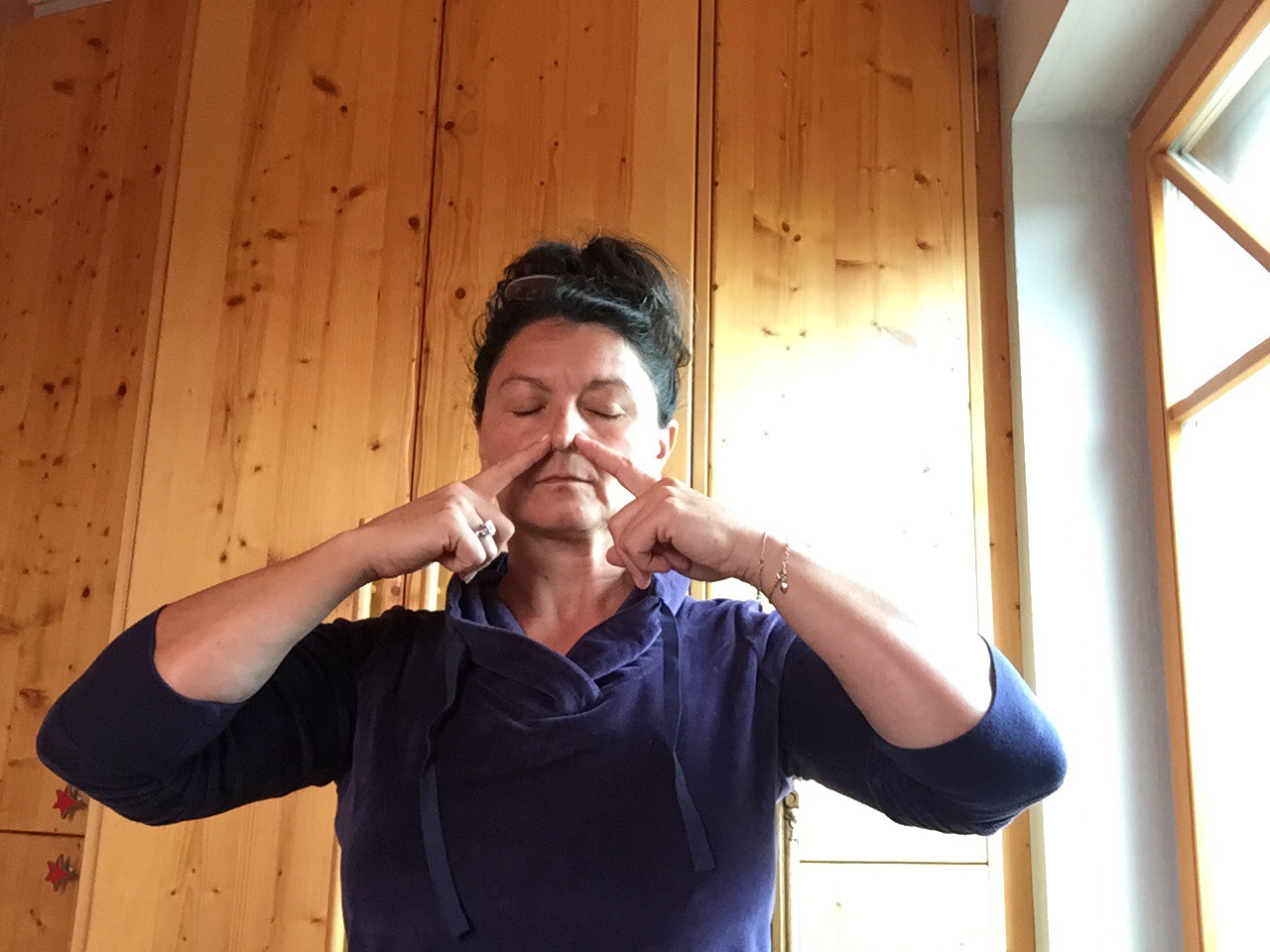 Dabei legen Sie Ihre beiden Zeigefinger links und rechts auf Ihre Nasenflügel (bitte achten Sie darauf, dass Ihr Schultergürtel dabei entspannt bleibt!!)