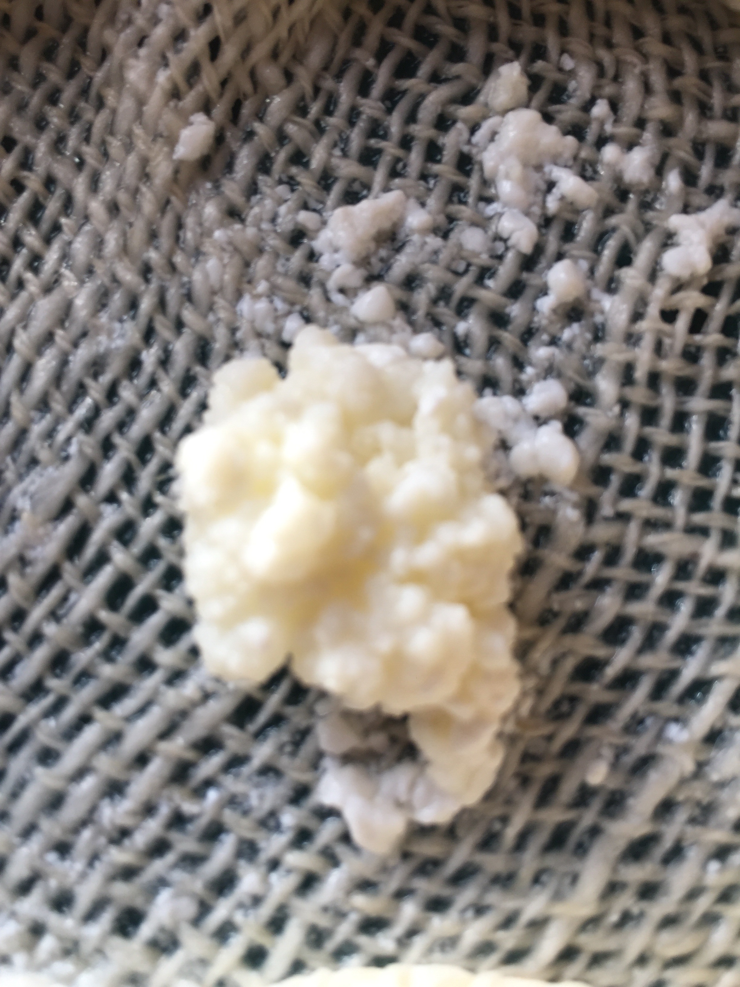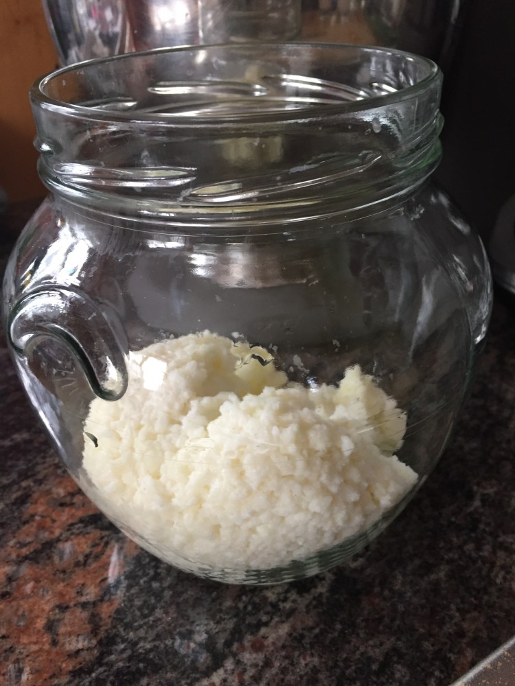 Jetzt nach ein bisschen mehr als 3 Monaten steht wieder ein „Umzug“ bevor. Der Pilz an sich hat zwar schon noch Platz, aber mittlerweile gieße ich mit einem Liter Milch auf, und das geht sich dann beim Ernten und durch mein Tuch drücken im Tuch fast nicht mehr aus, ohne dass er am oberen Rand überquillt😉.